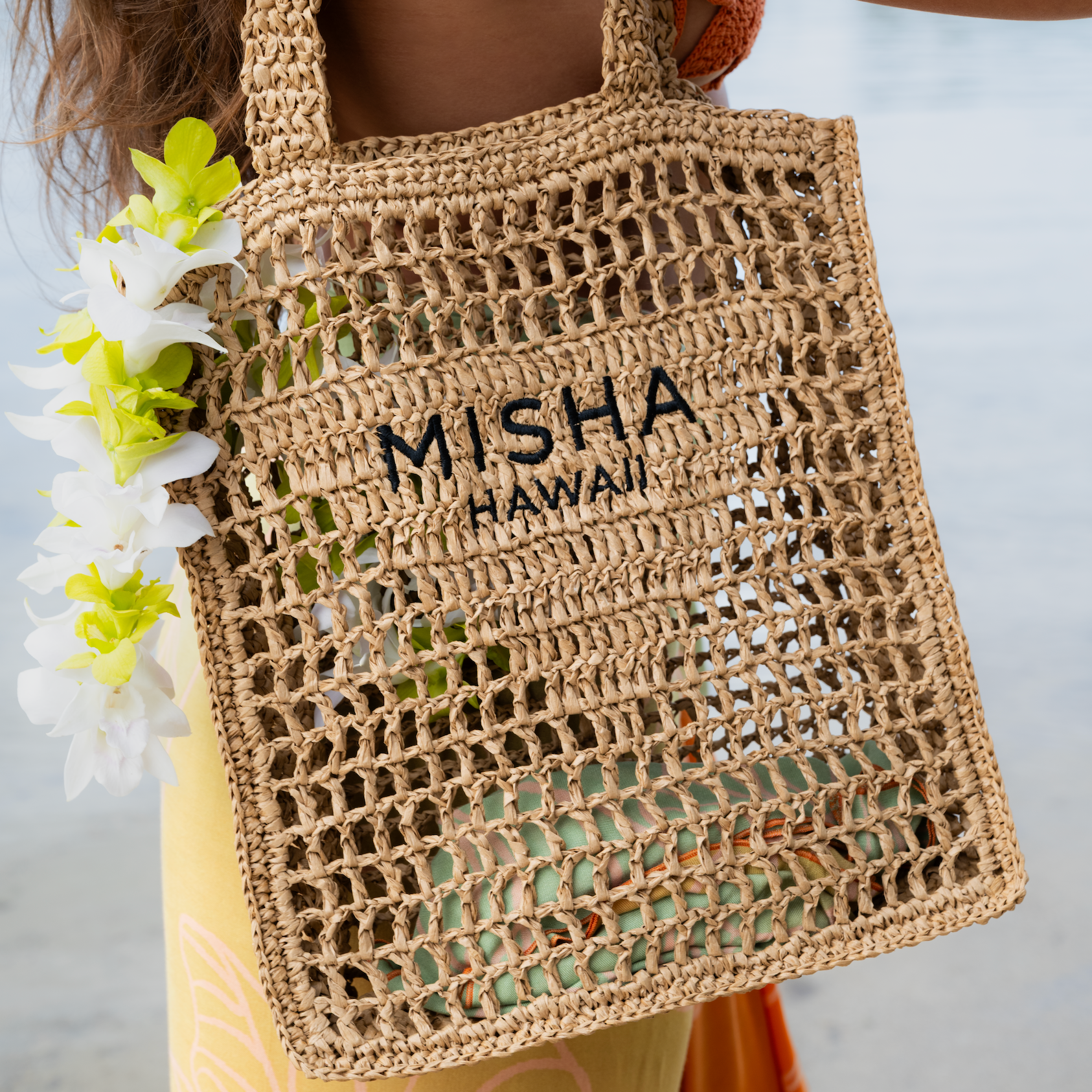 Raffia Mesh Tote Bag with a beautiful Misha Hawaii Logo. Use this tote for the beach, grocery store or wherever your adventures may take you!